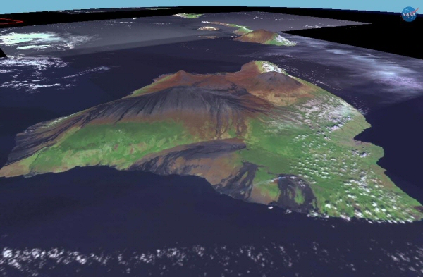 Das hier ist Big Island, eine der Inseln von Hawai’i. Groß in der Mitte der Mauna Loa, rechts dahinter Mauna Kea, im Vordergrund die teilweise noch aktive Region des Hawaii Volcanoes National Park. Alles zusammengebaut aus Satellitenbildern, 3D, frei dreh- und zoombar und überhaupt ein Riesenspaß.
