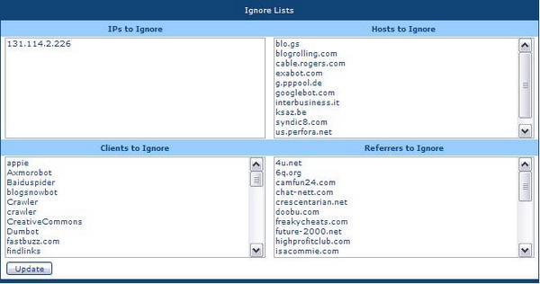 Dankenswerterweise haben sich sowohl Logfiler als auch Trackpro dieses Themas angenommen. Man kann bei beiden angeben, welche Zugriffe nicht mitprotokolliert werden sollen. Während man das bei ersterem noch direkt in einem entsprechenden config-File machen muss, ermöglicht TrackPro das in der neuen Version 2 (aktuell in Beta) über die grafische Oberfläche:
