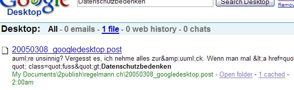 Hab ich geschrieben, die Google Desktop Suche (GDS) wäre unsinnig? Vergesst es, ich nehme alles zurück. Wenn man mal Datenschutzbedenken (die bei Google in letzter Zeit immer wieder hochkochen, aber schlussendlich bei jedem kommerziellen Anbieter angebracht sind) außer Betracht lässt, macht dieses Tool so richtig Spaß.